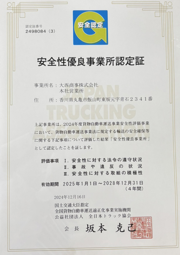 大西商事では、毎年の厳しい審査をクリアし、安全性優良事業所(Gマーク)の認定を平成28年から継続取得しています。